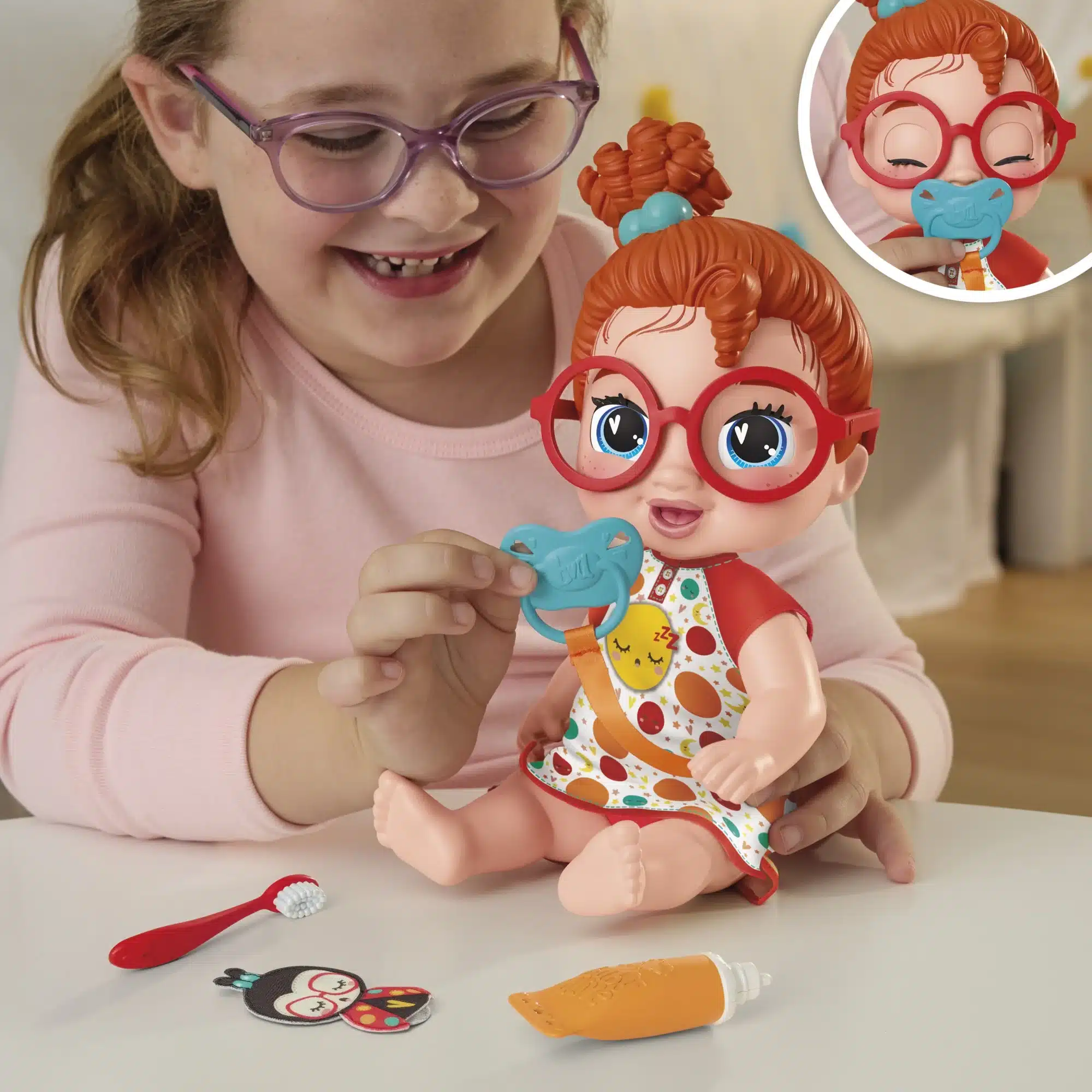 Bağlı emzik ve gözlüklü bebek, parmak kuklası, oyuncak diş fırçası ve oyuncak diş macunu içerir.