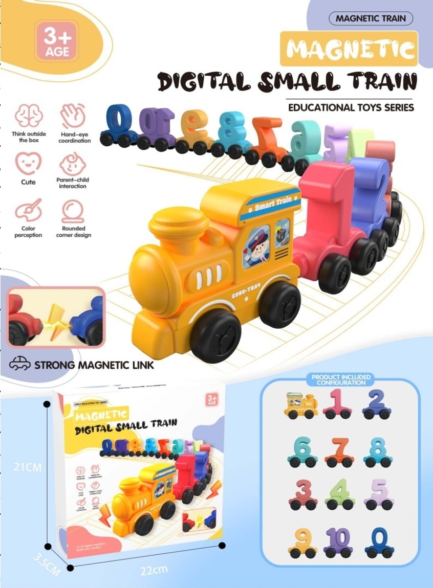 Dijital Manyetik Tren: Ahşap raysız numara tren seti, ayrı gövdeli ve mıknatıs bağlantılı 11 numara ve 1 tren başlığından oluşur.